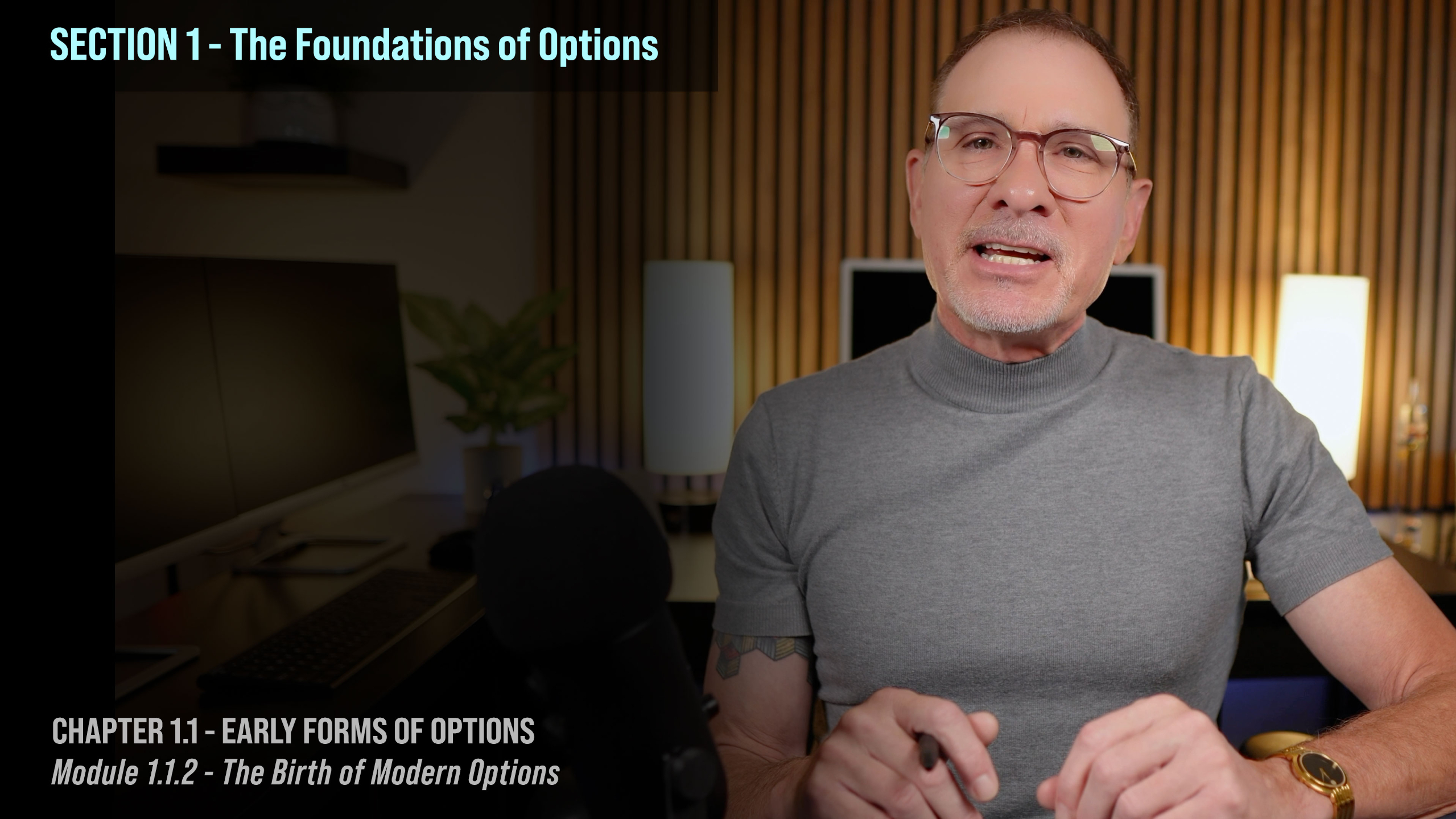 Approximately 12 hours of clear, focused and thoughtfully sequenced video modules, sections and chapters designed to build your options knowledge from the ground up. Each module is a full video discussion of each topic and includes quizzes and final tests culminating to a final exam at the end of the course.